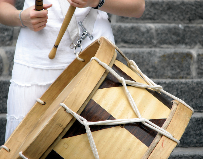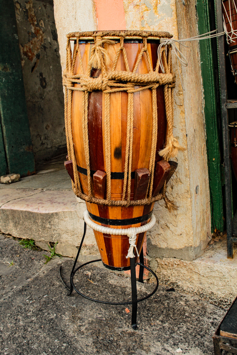 おもにマラカトゥで使われる、大きな木製の太鼓。皮を張り、低く重厚な音を出して、リズムの基盤となる。