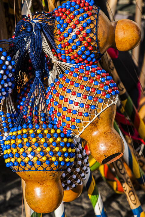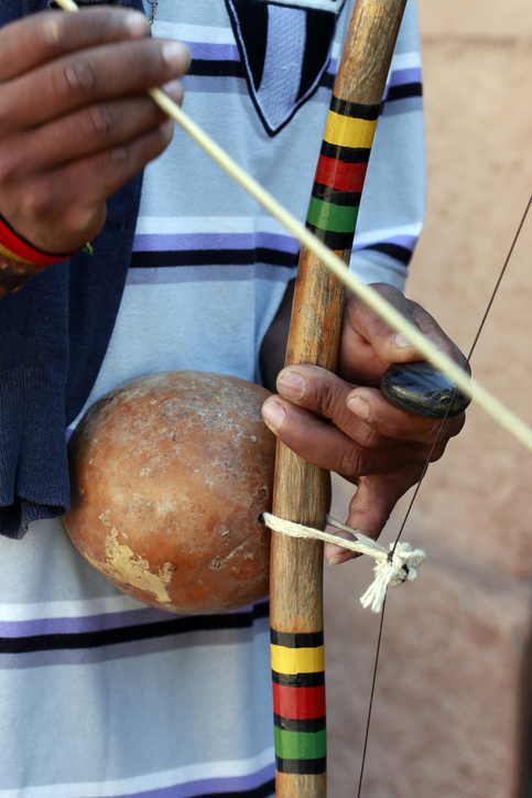 弓状の木にワイヤーと瓢箪(ひょうたん)の共鳴器を付けた単弦楽器。独特のうねる音を出し、主にカポエイラでリズムを司る。