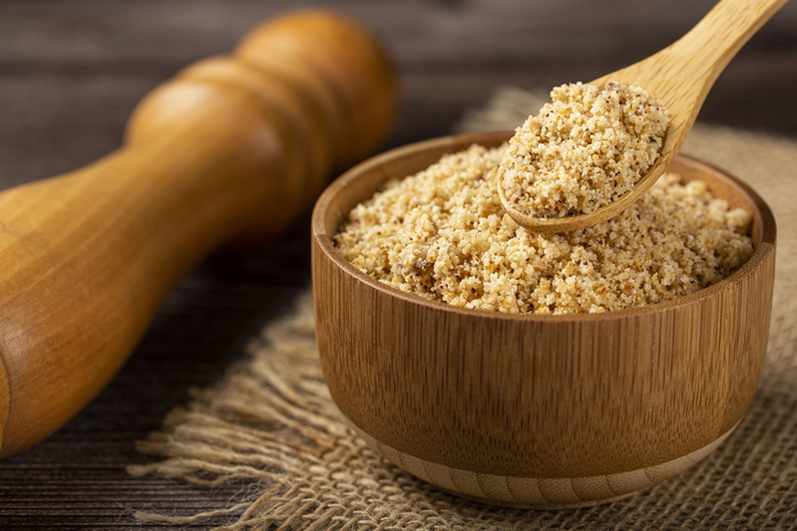 マンジョッカ粉を炒めた副菜。サラサラ、カリッとした食感で、肉料理やフェイジョアーダの付け合わせ(イメージは「ふりかけ」)として広く使われる。